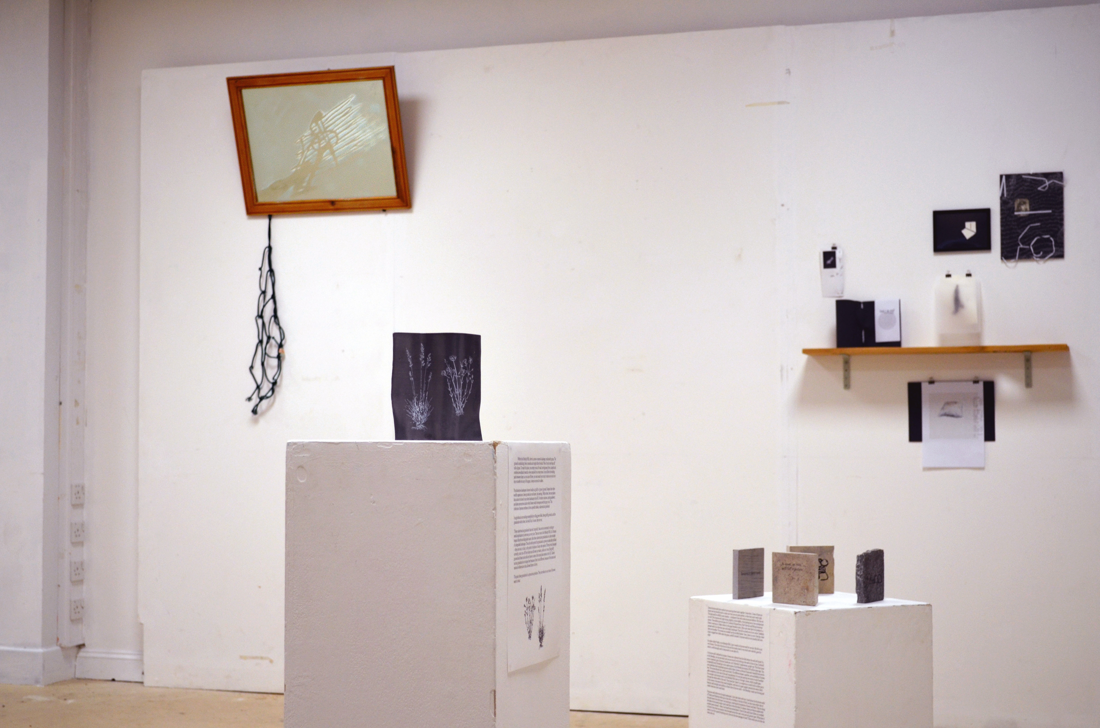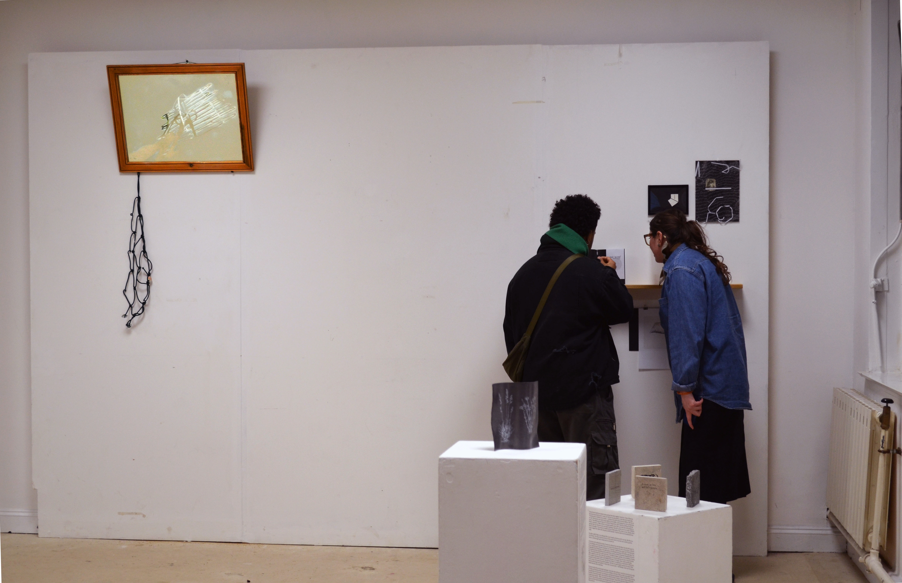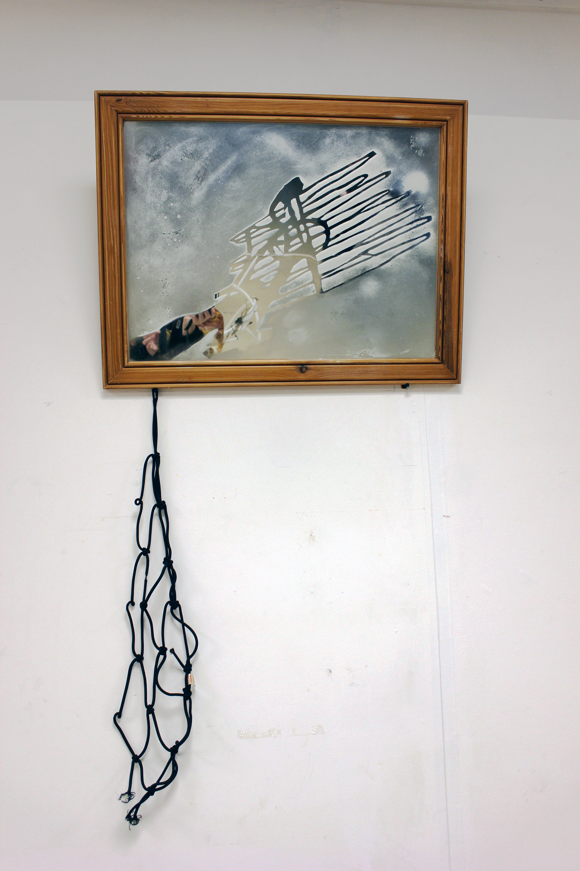 Wood framed mirror, Hairspray, Fixative, Bike rack bungee cord. 2025 This work changes itself depending on what angle you look at it, following you around the room.